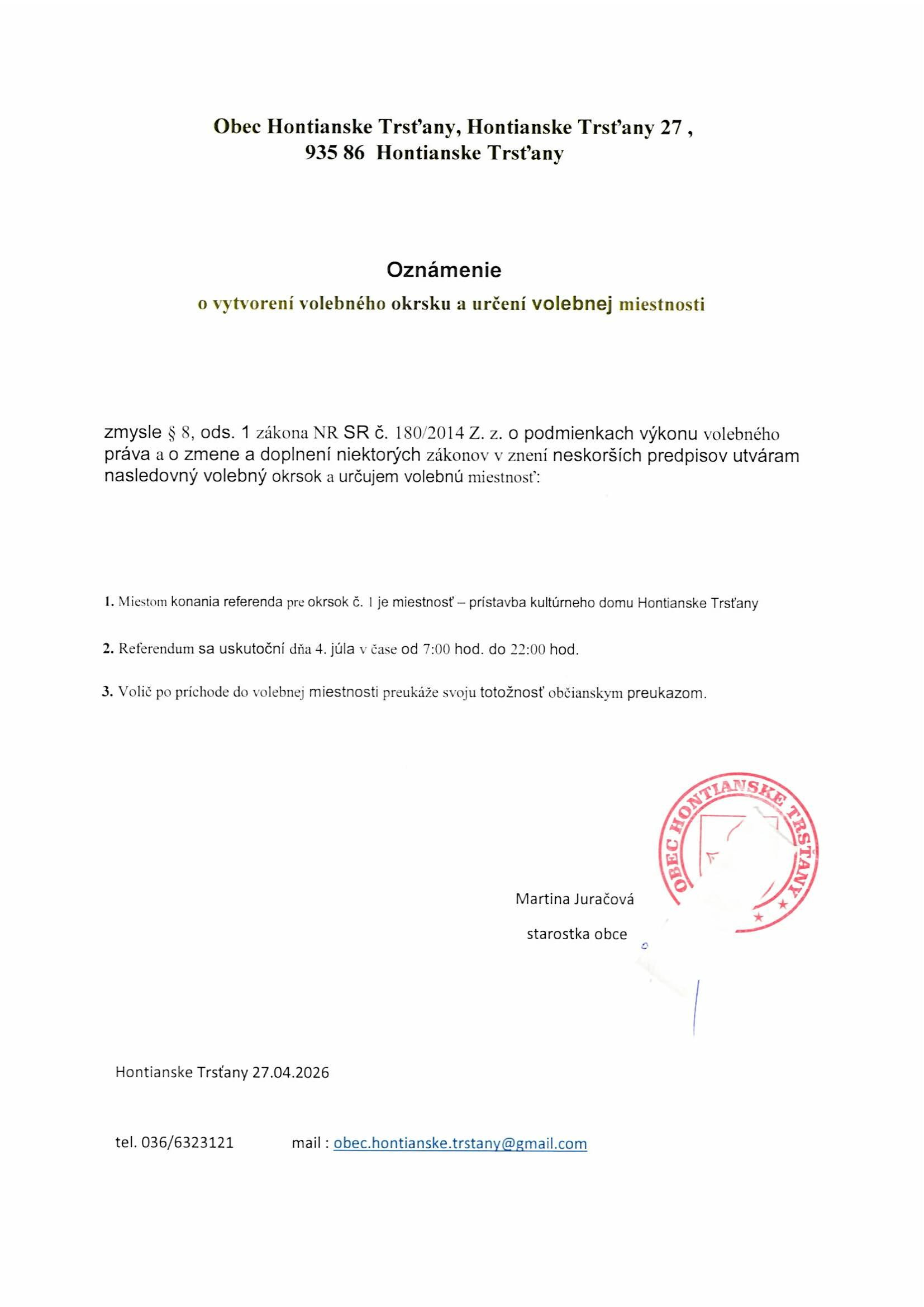 oznámenie o vytvorení volebného okru a určení volebnej miestnosti